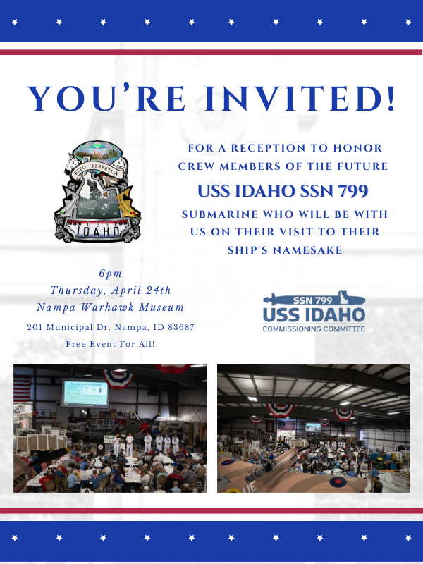 You're invited to a FREE reception to honor crew members of the future USS IDAHO SSN 799 submarine who will be with us on their visit to their ship's namesake. Thursday, April 24 at 6 p.m.